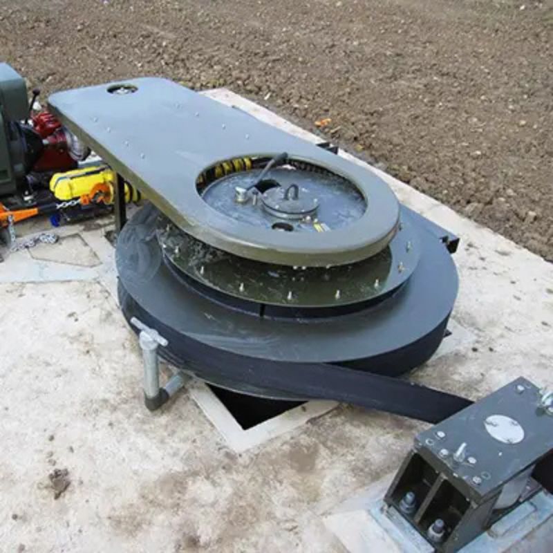 In hook cable applications a sprocket assembly and diesel (or electrical) engine tape rewind is standard to pre-tension the pendant cable. An electrical mini-retrieve is offered for rewinding the tape in net barrier configuration.